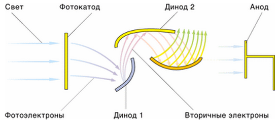 - фотоумножители на дискретных динодах сквозного типа (динодами являются сетки, жалюзи, плёнки),