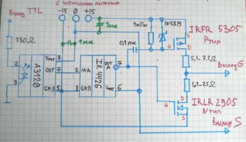Есть еще один вариант управления IGBT/FET с двухполярным питанием. В нем нет зависимости от частоты управления IGBT моста, как при применении трансформаторной развязки. Работает от десятков герц до 800 кГц – проверено, может и выше (диапазон достаточно широк). Схема требует внешнее изолированного питания +15–0–15 вольт на каждый канал, но в полном мосте можно обойтись и двумя.